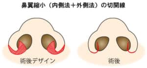 内側法と外側法を同時におこなうことで小鼻の幅と張り出しの両方が減って小鼻が小さくなるのはもちろん、土台からずらせるので効果が高まり、後戻りもしにくくなります。